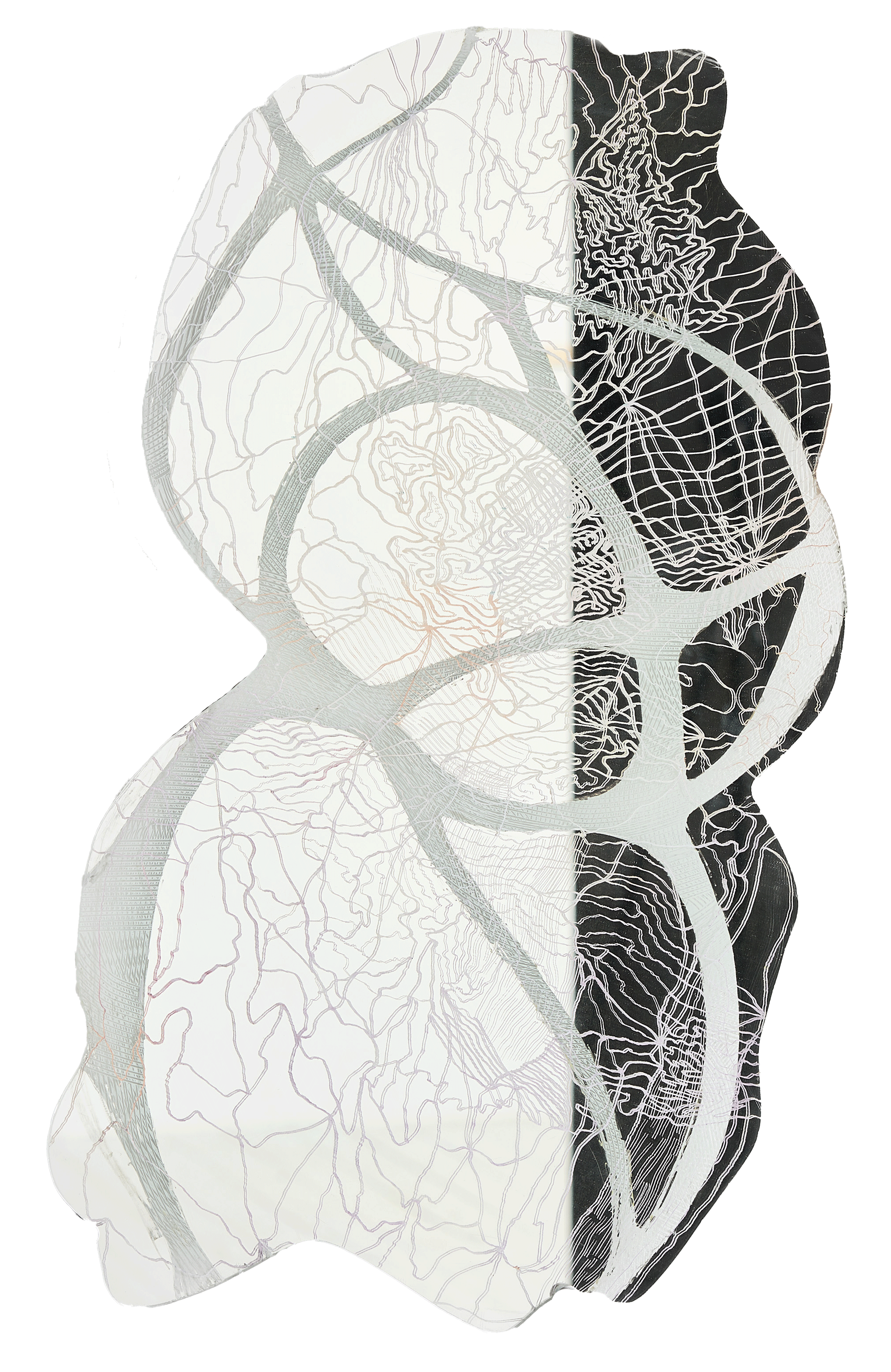 Abstraktes, Bildobjekt aus Spiegelglas mit gravierten, verschlungenen Linien von der Künstlerin Hadin Schorn