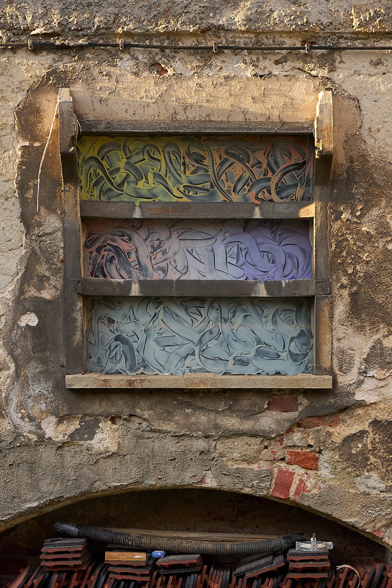 Drei farbige, abstrakte HInterglasmalereien, die an Graffiti erinnern von der Künstlerin Hadin Schorn in einem alten, rauen Wandgewölbe, darunter eine Reihe von Ziegeln und ein schwarzes Rohr.